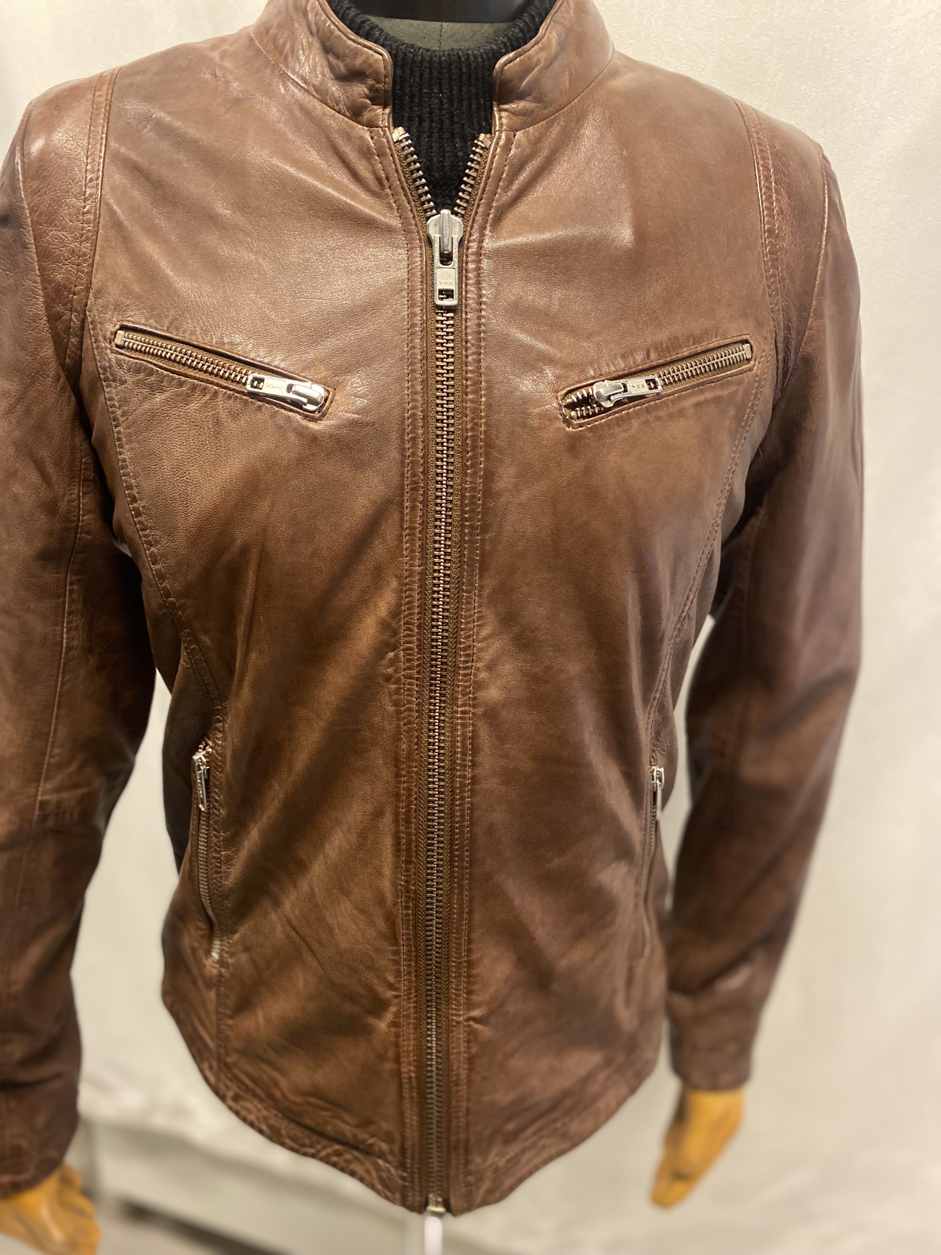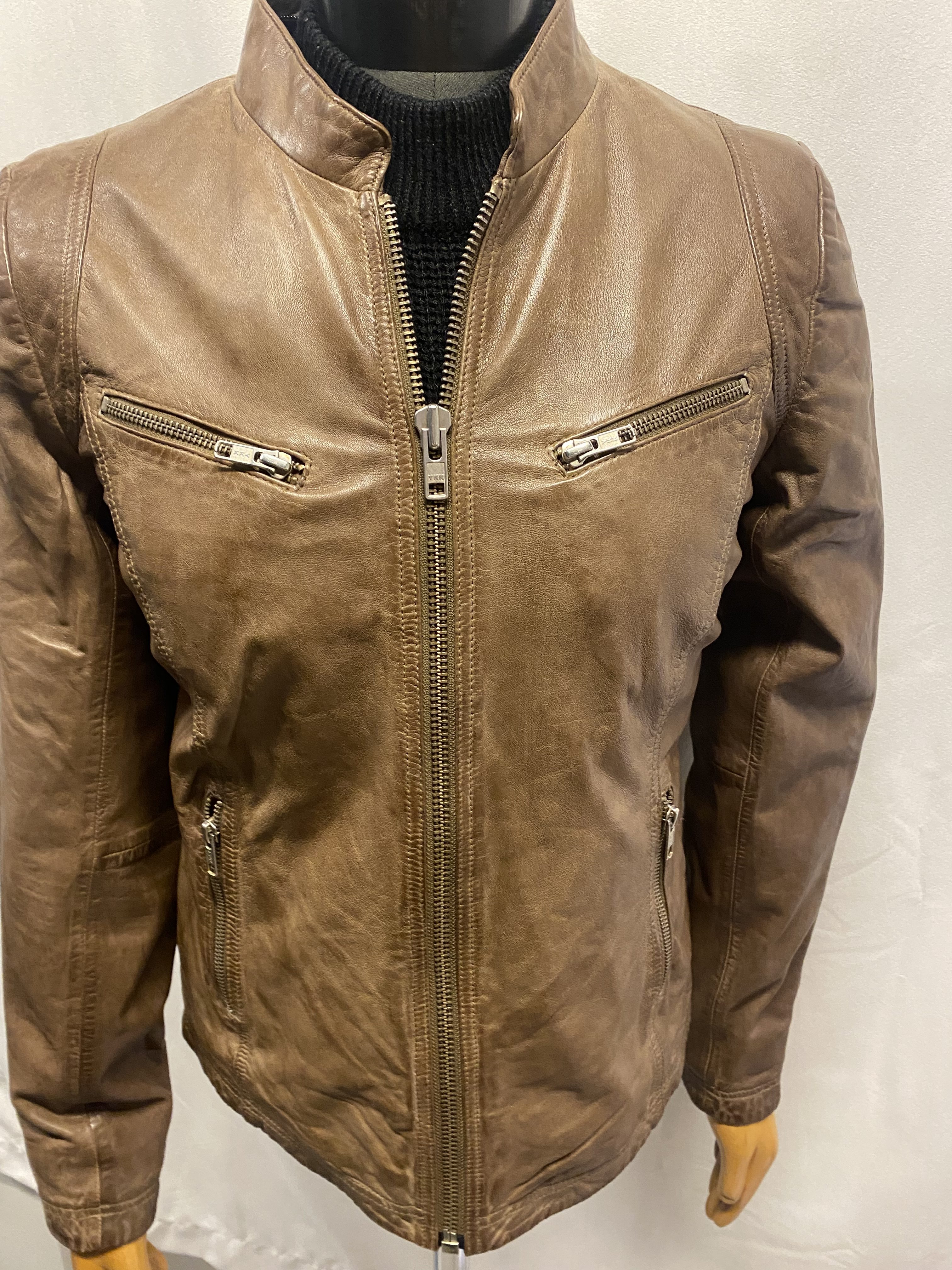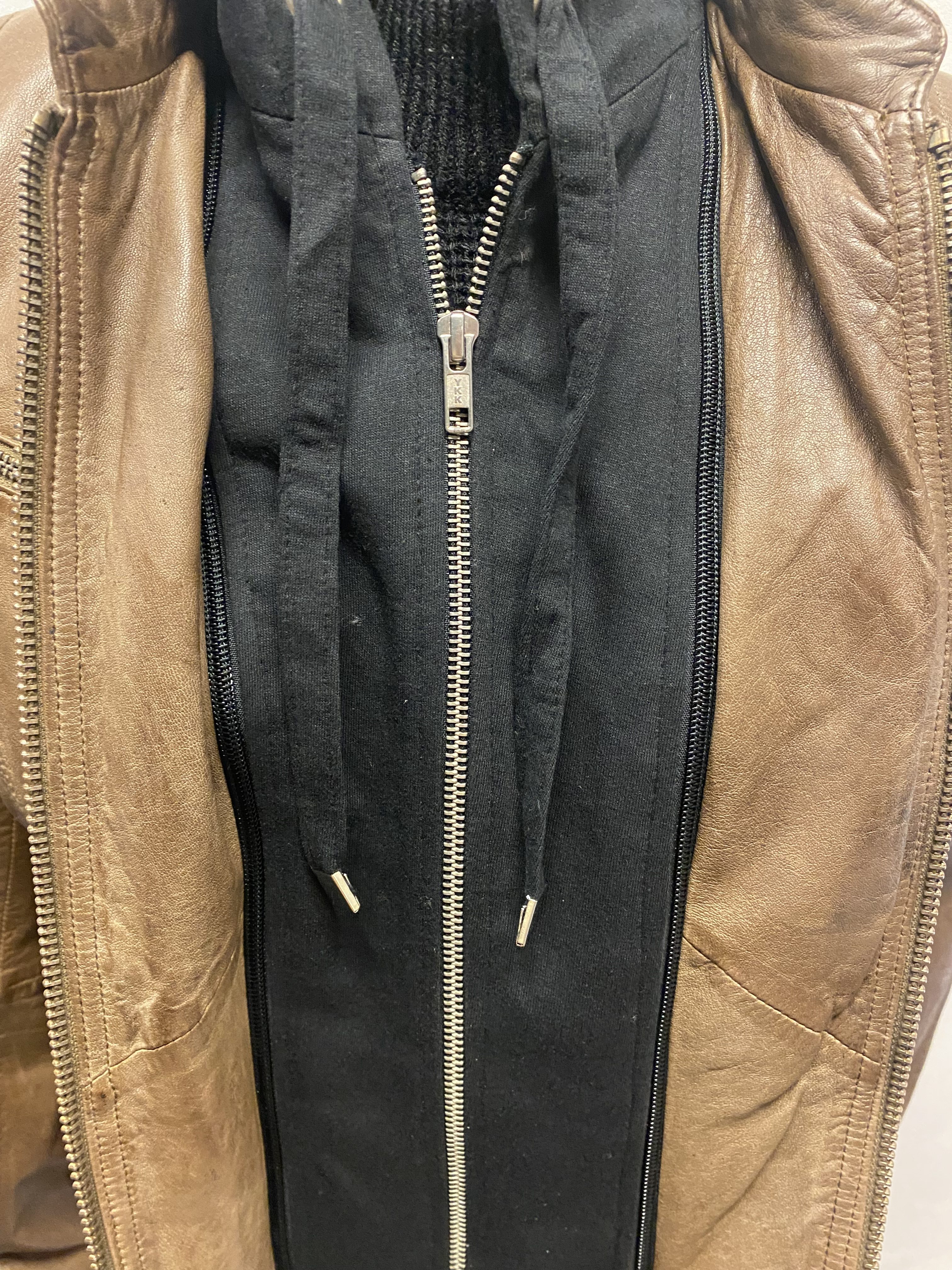 Snygg stilig skinnjacka i lammskinn med löstagbar hood, bra med fickor samt även på innersidan