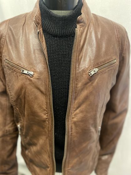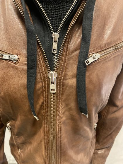 Taggar: äkta lammskinn dam, biker modell dam, löstagbar hood, skinnjacka brun dam, ute och inne jacka