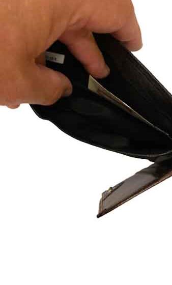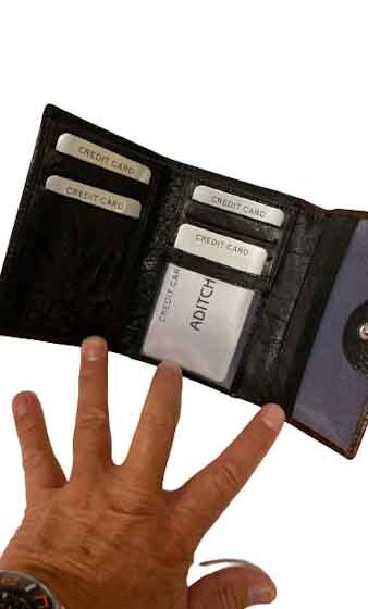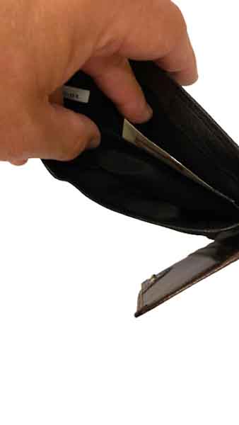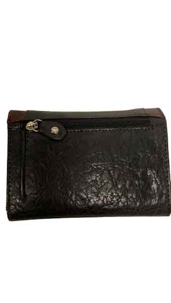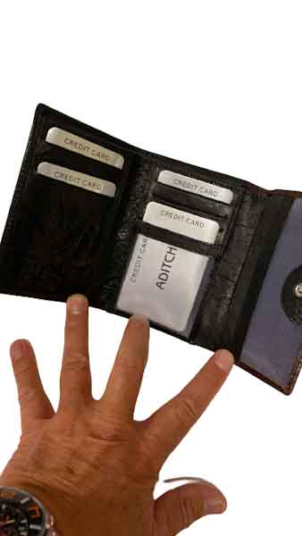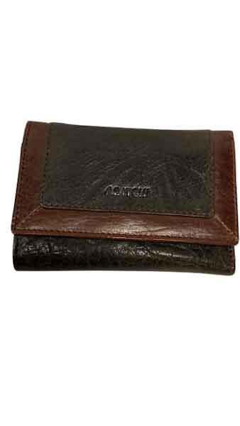 Plånbok i kalvskinn, lagom stor för att få plats med kort, sedlar samt mynt.
